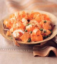 But peelings made from the carrot’s luscious inner meat, instead of its tough outer skin, taste and look great. They’re long and slender, and if you turn your head and squint at them for a while, they begin to remind you of fettuccine. Or at least that’s what they reminded me of when I developed this recipe for Gourmet. Indeed, these peelings not only look like fettuccine but they take to quick cooking like fettuccine especially if you leave them al dente. They’re delicious this way, with the side benefit that you might bamboozle some child to eat cooked carrots because this time they don’t look like carrots but like orange pasta. Leave out the shrimp if you want to make this recipe vegetarian.